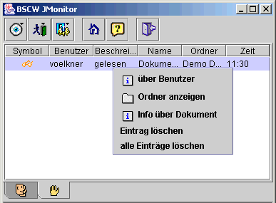 5.2.2.1 EreignisansichtWenn es für Sie wichtig ist, sofort zu wissen, dass beispielsweise ein bestimmtes Dokument bearbeitet und wieder auf dem Server abgelegt wurde, dann ist die Ereignisansicht der schnellste und bequemste Weg, diese Information zu bekommen und das geänderte Dokument vom BSCW Server zu holen. Wenn Sie eingrenzen können, welche Typen von Ereignissen für Sie im Moment so relevant sind, dass die Monitor-Funktion darüber berichten soll, können Sie die Ereignisansicht unter Bearbeiten Neu Einstellungen auf diese Typen von Ereignissen fokussieren. Je enger dieser Fokus, desto eher isst es sinnvoll, sich von der Monitor Funktion mit einem optischen und/oder akustischen Signal auf relevante Ereignisse hinweisen lassen. Abbildung 5.2-2: JMonitor - Ereignisansicht Wählen Sie das Ereignis in der Ereignisliste und klicken Sie mit der rechten Maustaste, um über ein Pop-up Menü