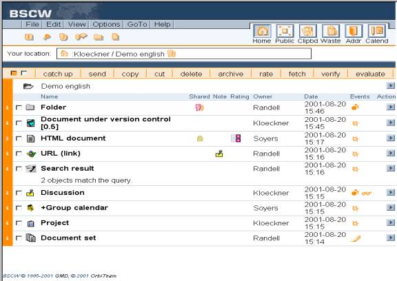 In the HTML-based user interface, BSCW presents the contents of a Folder or Workspace as the central part of a page – preceded by a header containing popup menus, buttons and action shortcuts. Figure 1 shows a Folder page with examples of the objects that you can create and share in BSCW. Please note that different icons are used to represent the different types of objects.