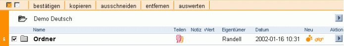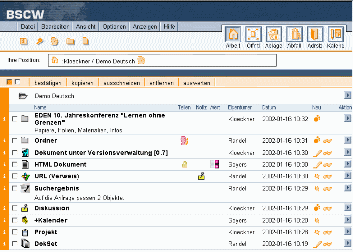 Der in Abbildung 1 gezeigte Ordner BSCW Demo Deutsch enthält einen Eintrag für ein Objekt jeden Typs. Jedes Objekt wird durch eine Zeile repräsentiert, beginnend mit einer Checkbox, in der Sie mit einem Klick das Objekt für bestimmte Aktionen auswählen können, einige Schaltflächen, zusätzliche Objektinformationen und eine Schaltfläche für ein Aktionsmenu.