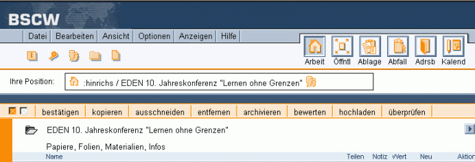 4.4.4 Banner für den Arbeitsbereich erstellenJede Ordner-Übersichtsseite hat einen Kopf, der aus mehreren Zeilen besteht (siehe Abschnitt 3.1). Nach Voreinstellung ist der Platz unter der Navigatiosleiste leer: Abbildung 4.4-1: Kopfbereich einer Ordner-Übersichtsseite ohne Banner Hier können Sie ein Banner einfügen: