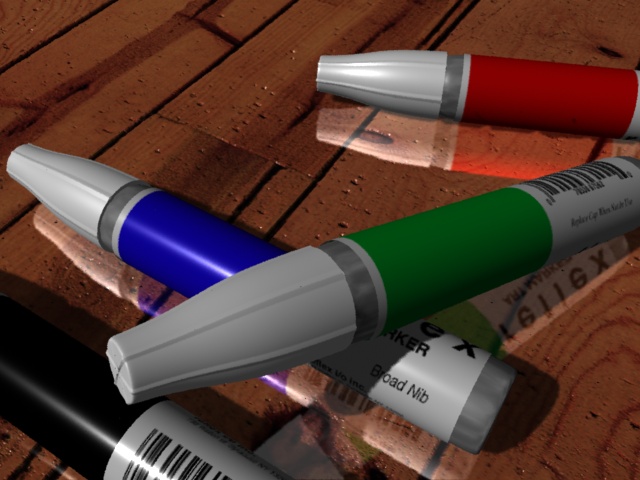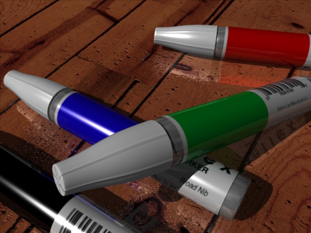 The reflection below the top of the green pen has some artifacts in the BMRT