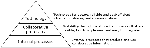 Figure 1. Inter-company collaboration builds on high quality internal processes as well as scalable collaborative processes that can be made efficient using electronic communication technology.When looking at the requirements that collaboration presents (Figure 1), it becomes clear that technological issues form only a small part of the challenge of implementing large-scale CPFR. Despite this, it has been subject of much discussion. Different companies have chosen different approaches in building the infrastructure for collaboration, often relying on internet or extranet solutions. In addition, especially in the consumer packaged goods business, electronic marketplaces have aggressively marketed themselves as solutions for CPFR.