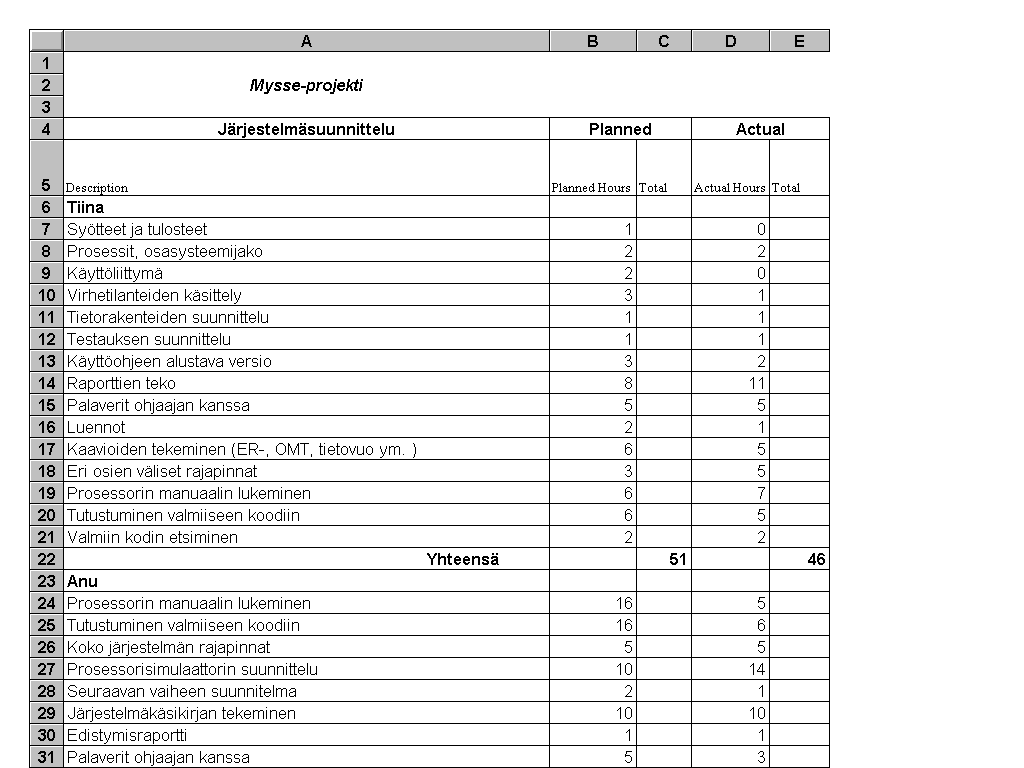 suunnitellun ja toteutuneen ajankäytön välillä oli yhteensä 29 tuntia.