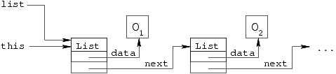 Tarkastelemme askel askelelta, miten metodi toimii. Käytämme yksinkertaista laatikko-nuoli-merkintää olioille ja muuttujille. Kukin olio esitetään laatikkona, joka sisältää olion tyypin sekä muuttujien arvot. Muuttujat ja olioiden sisältämät viittaukset (joilla on merkitystä metodin toiminnan kannalta) toisiin olioihin esitetään nuolina.