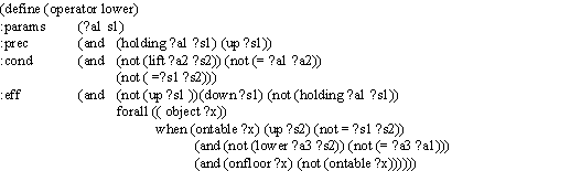 An example (Boutilier&Brafman97) is presented in figure. The precondition is that the agent is holding the side s1 of a table that is raised. There is a non-concurrency condition that no other agent is simultaneously raising the other side of the table. The primary effect is to have the other side of the table down. In addition the conditional effect states that when there is no concurrent lower action of the other side of the table, and there is some object on the table, that object falls to the floor.