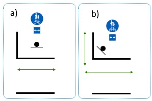 Mikäli pyörätie halutaan osoittaa risteyksen kulmassa kahteen eri suuntaan, tulee merkki sijoittaa risteyksen kulmaukseen 45 asteen kulmaan, ks. Kuntaliiton julkaisema "Liikennemerkkien käyttö kaduilla", kuva 4.8. Muussa tapauksessa vaikutusalue ei ole haluttu. Suositeltavampaa on poistaa nämä merkit kokonaan ja korvata kahdella erillisellä merkillä, koska myös nämä tulee varustaa kaksisuuntaisen pyörätien lisäkilvellä.