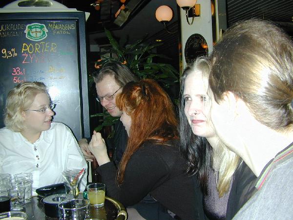 Väkeä baarissa. Marikki, PLZI, Nelle, Tassu ja Noozi.